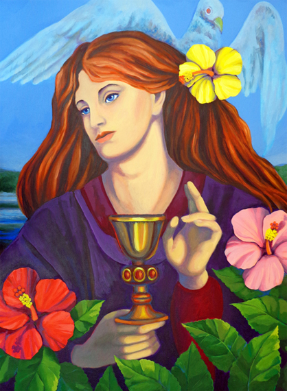 oil and watercolors, she also incorporates recycled objects, babbles and jewels